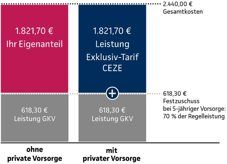 Hier ein kleines Beispiel, wie die Kosten für einen Zahnersatz in Höhe von 2440,00 EUR aufgeteilt werden: